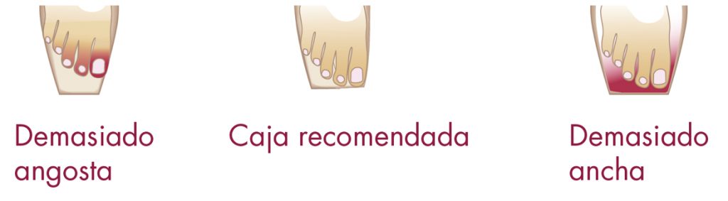 Las cajas varían según el modelo y hay que fijarse en dos factores, la anchura (dentro de la anchura podrá estrecharse hacia la punta, ser un poco ovalada u homogénea) y el alto de la caja (dependerá de lo largos que tengamos los dedos o de la flexibilidad del pie, si se tiene mucho empeine, a lo mejor es necesario una caja alta para que no se venza el pie hacia delante).